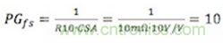 LM25116評(píng)估板的功率級(jí)跨導(dǎo)由10mΩ的電流檢測電阻(R11)和電流檢測放大器增益(10)設(shè)定,并滿足10A的電流極限。最終的功率級(jí)跨導(dǎo)等于: