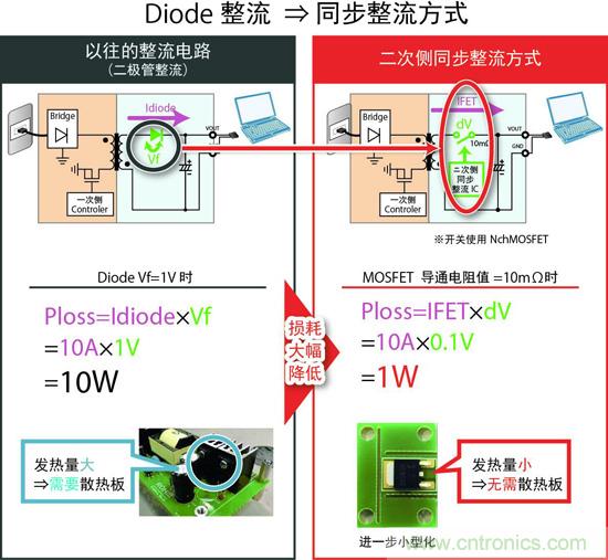 同步整流方式的整流元件使用MOSFET,通過更低的導(dǎo)通電阻(低Ron)來降低導(dǎo)通損耗(圖1)。工作與一次側(cè)的開關(guān)工作同步使整流元件的MOSFET進行ON/OFF。