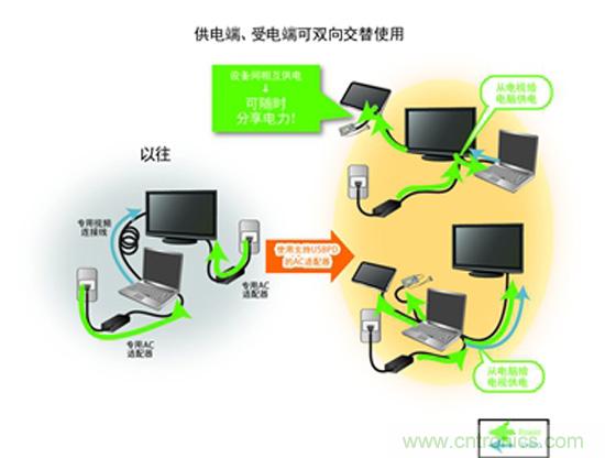 USB PD通過USB連接可實現(xiàn)高達100W的供電。USB PD根據(jù)不同設(shè)備的電源電壓要求,來調(diào)整AC/DC適配器等電源的輸出電壓。以往每臺設(shè)備都需要電源,而利用USB PD則可共享1個電源。另外,以往在設(shè)備之間主要 是數(shù)據(jù)通信,而通過USB PD可同時實現(xiàn)雙向相互供電(圖3)。