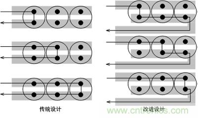 輸出濾波電容放置及走線(xiàn)對(duì)紋波噪聲至關(guān)重要,如圖1所示,傳統(tǒng)設(shè)計(jì)中由于到達(dá)每個(gè)電容的阻抗不一樣,所以高頻電流在三個(gè)電容中分配不均勻,改進(jìn)設(shè)計(jì)中可以看出每個(gè)回路長(zhǎng)度相當(dāng)即高頻電流會(huì)均勻分配到每個(gè)電容中。
