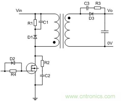 二極管在高速導(dǎo)通和關(guān)斷時(shí),反向恢復(fù)期間,二極管的寄生電感和電容會(huì)產(chǎn)生高頻振蕩,為了抑制高頻振蕩可在二極管兩端加RC緩沖電路如圖2所示,電阻R3一般在1Ω~100Ω,電容C3一般在100pF~1nF,如果電源工作頻率較低,效率滿(mǎn)足要求的話(huà),二極管D3可以選擇反向恢復(fù)時(shí)間較慢的二極管。