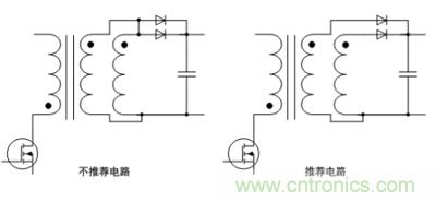 當(dāng)電源輸出電流較大時(shí),通常我們會(huì)采用兩個(gè)繞組并聯(lián)的方式進(jìn)行使用,這兩個(gè)繞組通常分置于原邊繞組內(nèi)外,所以直流阻抗會(huì)略有差異,從而有可能產(chǎn)生內(nèi)部環(huán)流,電壓波形也會(huì)出現(xiàn)嚴(yán)重的振鈴,并且電磁干擾會(huì)變的更加嚴(yán)重,以及有可能會(huì)出現(xiàn)意外的大量發(fā)熱,如果輸出繞組一定需要并聯(lián)使用,最好采用如圖4的推薦電路,圖4推薦電路中二極管可以消除兩個(gè)不同繞組的不均勻?qū)е碌呢?fù)面影響。