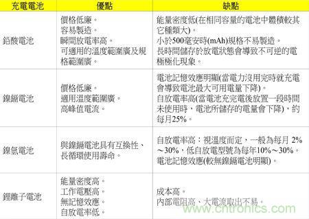 由表1優(yōu)缺點看來,鎳鎘、鎳氫及鋰離子電池較適合使用在電子產(chǎn)品上;而鋰離子電池?zé)o論是在體積、重量及容量(電子產(chǎn)品的使用時間)較優(yōu)于鎳鎘、鎳氫電池,也無記憶效應(yīng)的問題,所以鋰離子電池在電子產(chǎn)品使用上似乎方便許多。
