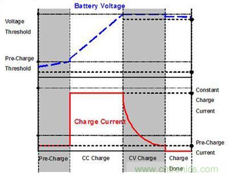 當電池充電電壓上升至約3伏特時,充電器改以最大充電電流對電池進行定電流充電,此時電池電壓持續(xù)上升。