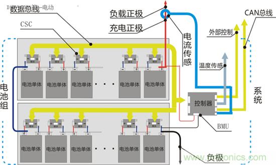 為了解決連線(xiàn)復(fù)雜的難題,出現(xiàn)了分布式架構(gòu)的BMS。這種BMS是將信息采集傳遞的功能與其他功能獨(dú)立分離,整個(gè)系統(tǒng)分成了CSC(單體管理單元)、BMU(電池管理控制器),CSC安裝在單串電池上,負(fù)責(zé)本串電池信息采集和傳遞,每串電池的信息通過(guò)總線(xiàn)傳入BMU。這種架構(gòu)通過(guò)總線(xiàn)解決了線(xiàn)束復(fù)雜的難題,而且安裝相對(duì)簡(jiǎn)單,效率高,柔性好,適合不同電池組規(guī)模大小。