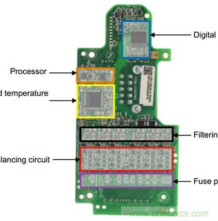 因?yàn)閮煞N均衡功能各有利弊,本來(lái)主動(dòng)均衡功能是可以替代被動(dòng)均衡功能的,但因?yàn)榻Y(jié)構(gòu)復(fù)雜成本高,而且結(jié)構(gòu)復(fù)雜之后故障率也會(huì)高而與被動(dòng)均衡處于膠著狀態(tài),業(yè)內(nèi)人士常為了哪種均衡更好爭(zhēng)論不休。特斯拉的BMS均衡功能(被動(dòng)均衡,見下圖中Cellbalancingcircuit中所指均為放電電阻)經(jīng)常被示范以證明被動(dòng)均衡強(qiáng)于主動(dòng)均衡。其實(shí)這反而證明了任何技術(shù)選擇都要和整體條件適用的道理。