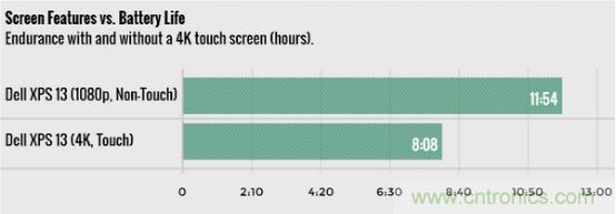 拋開電池技術(shù)本身止步不前的原因,筆記本電腦電池壽命沒有進(jìn)步的主要原因在于其他硬件發(fā)展。雖然處理器每一年都在功耗方面擁有一定進(jìn)步,但4K屏幕、觸摸屏、超輕薄設(shè)計(jì),對電池壽命都產(chǎn)生了消極的影響。以戴爾XPS 13為例,1080P非觸摸屏版本相比4K觸摸屏版本的電池壽命長了約4小時(shí)。