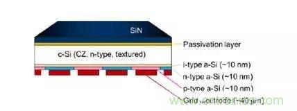 采用IBC與HJ技術(shù)結(jié)合的HIBC技術(shù)可以使電池效率進(jìn)一步提升,其結(jié)構(gòu)如圖4所示,在硅片表面同時(shí)采用本征的非晶硅進(jìn)行表面鈍化,在背面分別采用N型和P型的非晶硅薄膜形成異質(zhì)結(jié)。其優(yōu)點(diǎn)是利用非晶硅優(yōu)越的表面鈍化性能,并結(jié)合IBC結(jié)構(gòu)沒(méi)有金屬遮擋的結(jié)構(gòu)優(yōu)點(diǎn),采用相同的器件結(jié)構(gòu),日本松下和夏普公司目前取得了25.6%和25.1%的電池效率,這將成為未來(lái)IBC電池的重要方向。