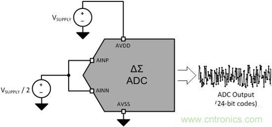 如圖1所示,你可以用短接至中電源電壓的正負(fù)輸入來指定和測(cè)量一個(gè)ADC的DC噪聲性能。通過測(cè)量這個(gè)條件下的噪聲,ADC輸出代碼內(nèi)的噪聲幾乎不受基準(zhǔn)電壓、基準(zhǔn)噪聲或輸入信號(hào)噪聲變化的影響。雖然這個(gè)測(cè)試條件相對(duì)于實(shí)際應(yīng)用來說是一個(gè)過于理想的情況,它的確較好地給出了一個(gè)不受某些外部噪聲源影響的ADC噪聲性能。