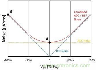 當(dāng)通過使用均方根增加的方法將基準(zhǔn)噪聲添加到ADC的噪聲中時(shí),這個(gè)組合噪聲是輸入電壓的函數(shù),它會(huì)在正或負(fù)輸入電壓變大時(shí)增加。在圖2中的曲線上,有幾個(gè)點(diǎn)需要注意: