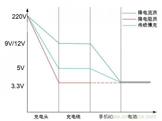 從電壓的角度來對比一下傳統(tǒng)慢充、降電阻快充技術與降電流快充技術,如下圖所示。