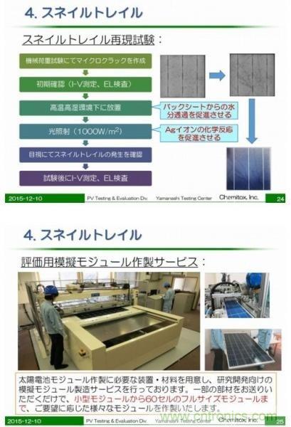 Chemitox提供制作這種驗證用太陽能電池板和再現(xiàn)蝸牛紋產(chǎn)生條件的服務,推動了開發(fā)。例如,封裝材料廠商只需帶來想驗證的封裝材料,從電池板的制作到評測就就能全部完成。