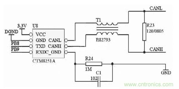 CAN-bus接口電路采用+3.3V供電,選擇CTM8251A隔離CAN收發(fā)器。該芯片是3.3V工業(yè)級(jí)的隔離CAN收發(fā)器。CTD0信號(hào)連接主控芯片的CAN控制器的發(fā)送腳,CRD0信號(hào)連接CAN控制器的接收腳。CTM隔離CAN收發(fā)器內(nèi)有一完整的CAN-bus隔離收發(fā)器電路,可以將來自CAN控制器的邏輯電平轉(zhuǎn)換為CAN總線信號(hào),并具有DC2500V隔離功能。另外,CTM收發(fā)器可以選擇集成ESD保護(hù)功能的“T”系列,從而省略外擴(kuò)的ESD保護(hù)器件。