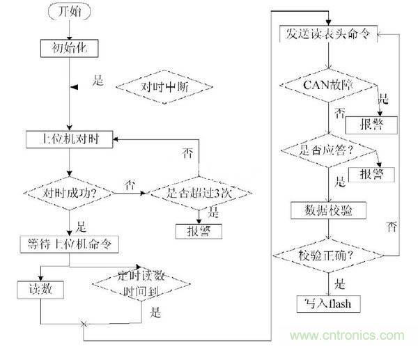 集中器通過CAN控制器發(fā)送讀表命令信號(hào)到總線上,每個(gè)表頭根據(jù)讀表命令將采集的信號(hào)通過CAN總線發(fā)送到集中器。集中器將采集的信號(hào)存儲(chǔ)在flash芯片中。上位機(jī)通過串口發(fā)送讀數(shù)據(jù)信號(hào)到集中器,集中器就把存儲(chǔ)在flash中的數(shù)據(jù)傳送給上位機(jī)。