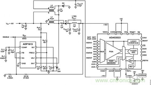 ADP1613用作單端初級(jí)原邊電感(SEPIC) Cuk轉(zhuǎn)換器,是ADAS3022在外部5 V電源供電情況下,為其提供20 mA時(shí)所需±15 V高壓電源以及最大值為3 mV的低輸出紋波的理想選擇。本應(yīng)用中,ADP1613的開關(guān)頻率為1.3MHz。如圖3所示,ADP1613盡可能地減少了外部元器件數(shù)目,并且具有超過86%的效率,因此它能滿足ADAS3022的規(guī)格要求。在該拓?fù)渲惺褂玫统杀続DP1613的最大優(yōu)勢(shì),是它在兩條供電軌之間的出色跟蹤能力,同時(shí)使用現(xiàn)成的耦合電感可產(chǎn)生±15 V電壓。除此之外,還能通過ADIsimPower設(shè)計(jì)工具輕松快捷地完成設(shè)計(jì)制造。