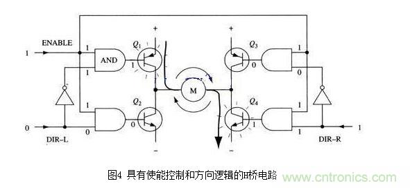 改進(jìn)電路在基本H橋電路的基礎(chǔ)上增加了4個(gè)與門和2個(gè)非門。4個(gè)與門同一個(gè)“使能”導(dǎo)通信號(hào)相接,這樣,用這一個(gè)信號(hào)就能控制整個(gè)電路的開(kāi)關(guān)。而2個(gè)非門通過(guò)提供一種方向輸人,可以保證任何時(shí)候在H橋的同側(cè)腿上都只有一個(gè)三極管能導(dǎo)通。(與本節(jié)前面的示意圖一樣,圖4所示也不是一個(gè)完整的電路圖,特別是圖中與門和三極管直接連接是不能正常工作的。)