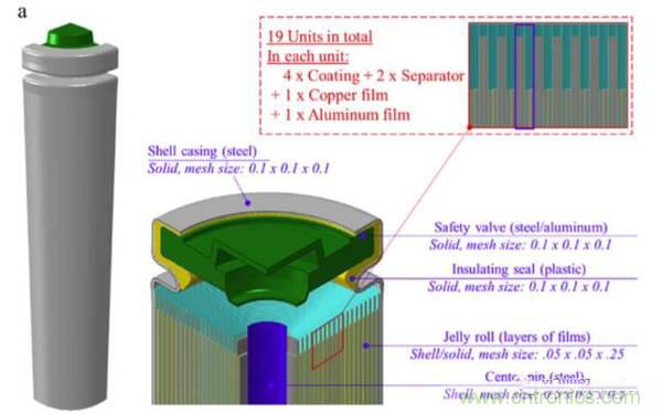 由于在動(dòng)力電池組中18650電池一般是采用垂直裝配的,在電池組發(fā)生跌落等情況下,軸向擠壓是造成鋰離子電池變形的主要原因,因此Juner Zhu主要研究了在軸向壓力下電池變形導(dǎo)致鋰離子電池短路的機(jī)理。一些傳統(tǒng)的模型由于假設(shè)鋰離子電池內(nèi)部是一個(gè)均一的整體,因此在預(yù)測(cè)18650電池軸向壓縮試驗(yàn)的時(shí)候就無(wú)法準(zhǔn)確預(yù)測(cè)試驗(yàn)結(jié)果,這主要是由于鋰離子電池電芯的特殊結(jié)構(gòu),導(dǎo)致在電芯的上部和下部并不完全一致,同時(shí)由于鋰離子電池上蓋(也就是正極)獨(dú)特的結(jié)構(gòu)使得鋰離子電池在承受軸向壓力的時(shí)候,可能會(huì)在內(nèi)短路發(fā)生之前,就引起鋰離子電池發(fā)生短路。