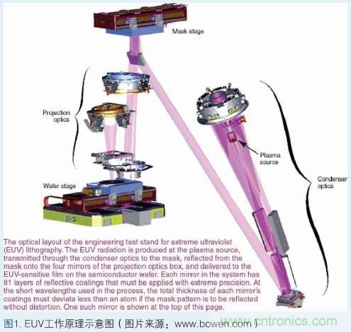 EUV的基本工作原理:激光對準氙氣噴嘴。當激光擊中氙氣時,會使氙氣變熱并產(chǎn)生等離子體;一旦產(chǎn)生等離子體,電子便開始逃逸,從而發(fā)出特定波長的光;接著這種光進入聚光器,然后后者將光匯聚并照到掩膜上;通過在反射鏡的一些部分施加而其它部分不施加吸收體,在反射鏡上形成芯片一個平面的圖案的光學表示,這樣就產(chǎn)生了掩膜;掩膜上的圖案被反射到四到六個曲面反射鏡上,從而將圖像微縮,并將圖像聚投到硅晶圓上;每個反射鏡使光線稍微彎曲以形成晶圓上的圖像,這就像照相機中的透鏡將光彎曲以在膠片上形成圖像一樣。