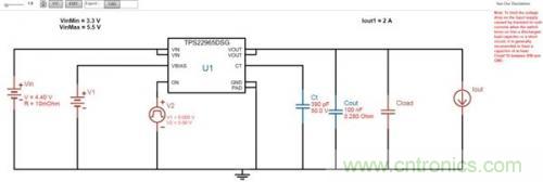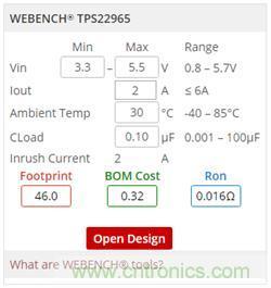 負(fù)載開關(guān)WEBENCH功能可通過產(chǎn)品頁面右側(cè)的WEBENCH組件實(shí)現(xiàn)。圖2顯示了TPS22965負(fù)載開關(guān)的組件。
