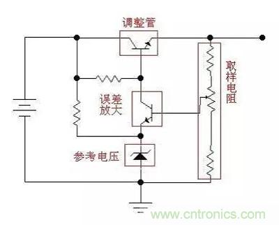讓我們繼續(xù):如果我們用一個(gè)三極管或者場(chǎng)效應(yīng)管,來(lái)代替圖中的可變阻器,并通過(guò)檢測(cè)輸出電壓的大小,來(lái)控制這個(gè)“變阻器”阻值的大小,使輸出電壓保持恒定,這樣我們就實(shí)現(xiàn)了穩(wěn)壓的目的。這個(gè)三極管或者場(chǎng)效應(yīng)管是用來(lái)調(diào)整電壓輸出大小的,所以叫做調(diào)整管。
