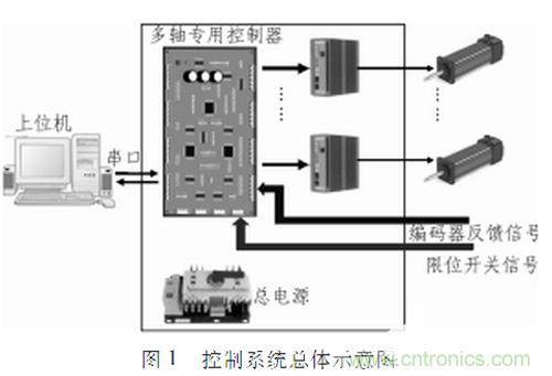 多軸控制器與上位機(jī)、電機(jī)驅(qū)動器等配合使用,圖1為采用多軸控制器組成的控制系統(tǒng)總體示意圖??刂破鹘邮丈衔粰C(jī)發(fā)送的控制指令,分析處理并產(chǎn)生相應(yīng)的方向信號、脈沖信號給驅(qū)動器,從而達(dá)到控制電機(jī)運(yùn)行的目的。為了提高系統(tǒng)的控制精度,將電機(jī)的編碼器信號作為反饋信號輸入給控制器(內(nèi)部實(shí)現(xiàn)自動辨向及四細(xì)分)。在各軸運(yùn)動過程中,專用控制器對電機(jī)運(yùn)行的絕對位移進(jìn)行記錄,并且可以實(shí)時地將各軸的絕對位置信息上傳給上位機(jī)。另外在電機(jī)運(yùn)行的過程中,為了保證電機(jī)運(yùn)行的安全性,控制器還采用了限位信號反饋實(shí)現(xiàn)全硬件保護(hù)措施。
