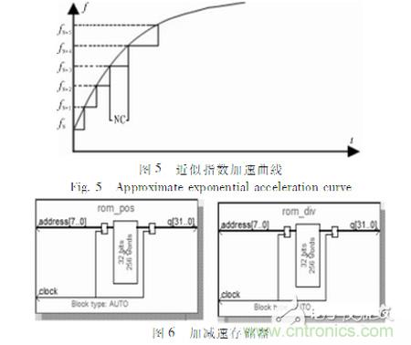 為了更有效、更理想地控制電機(jī)的運(yùn)行,在fpga內(nèi)部設(shè)計了加減速曲線模塊。文中采用了一種近似指數(shù)加減速曲線的方法,如圖5為近似指數(shù)加速曲線,減速曲線與之對稱。速度等距分布,那么在該速度級上保持的時間不一樣場。為了簡化,用速度級數(shù)N與一個常數(shù)C的乘積去模擬并且保持的時間用不熟來代替。因此,速度每升一級,電機(jī)都要在該速度級上走NC步(其中N為該速度級數(shù))。