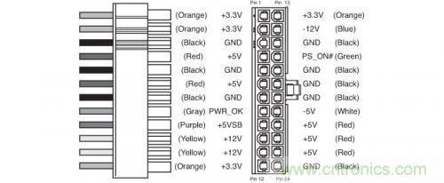 主板上的24pin供電接口就用到了PC電源上全部5種供電電壓,即+12V、+3.3V、+5V、-12V以及+5VSB,另外還有一個(gè)-5V,不過(guò)這個(gè)電壓對(duì)應(yīng)的硬件和接口實(shí)際上早已淘汰,因此現(xiàn)在的PC電源已經(jīng)不再提供-5V供電,在24pin接口中的這一路僅是名義上的存在。