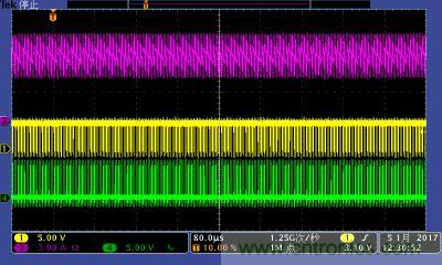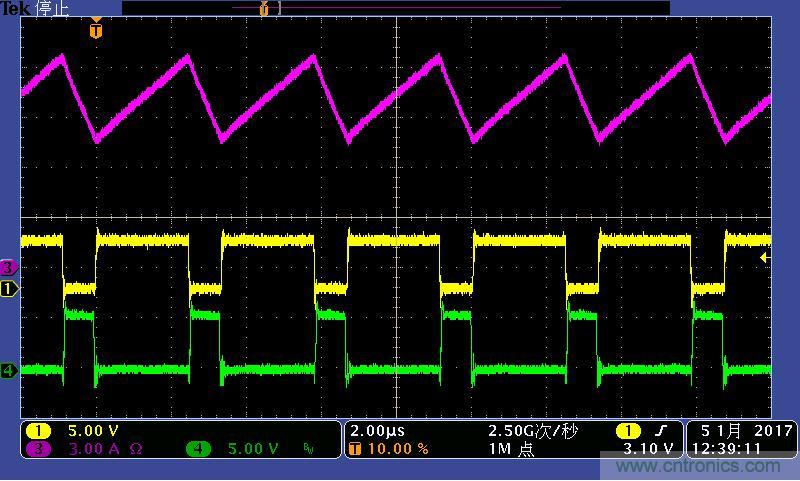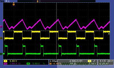 注:功率電感電流波形及高低端MOS管驅動波形。其中:①黃色:高端驅動波形;④綠色:低端驅動波形;③紫色:電感電流