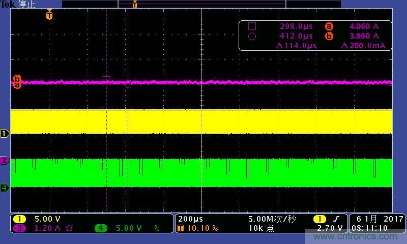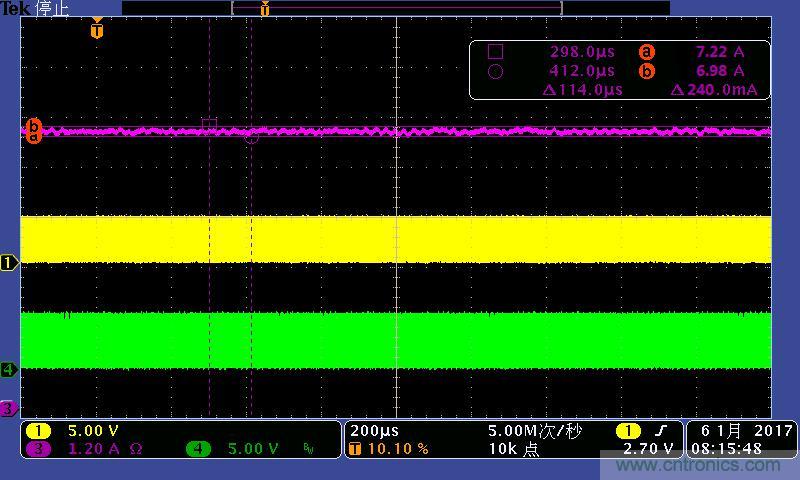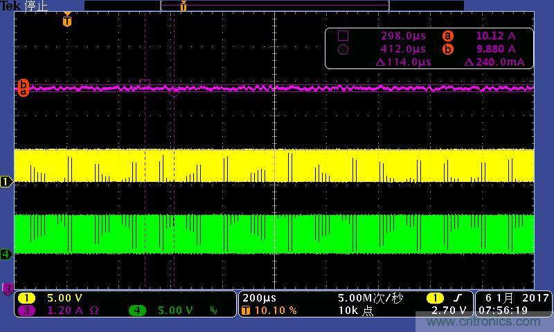 注:4A/7A/10A時的輸出電流波形。其中:①黃色:高端驅動波形;④綠色:低端驅動波形;③紫色:輸出電流
