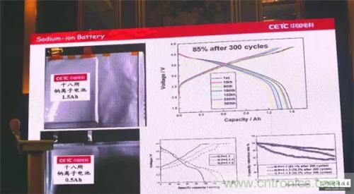 我們做了1.5Ah和0.5Ah兩種軟包全電池,正極材料采用前面提到的鎳錳氧化物,負(fù)極采用生物質(zhì)的硬碳材料,經(jīng)300次循環(huán)后容量衰降為15%。由此可見(jiàn),鈉離子電池用廉價(jià)材料是可以制備的,而且電性能良好。