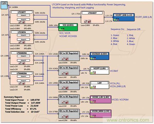 圖 3:用于 Arria 10 GX FPGA 電路板 (圖 1) 的電源樹(shù)。用 LTpowerPlanner 設(shè)計(jì),該軟件是一款分析性和簡(jiǎn)便易用的初步設(shè)計(jì)工具以用來(lái)映射電源要求。