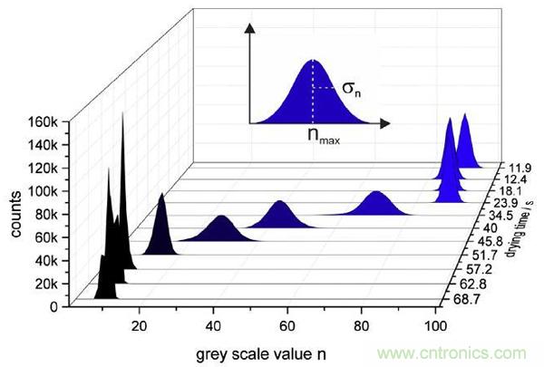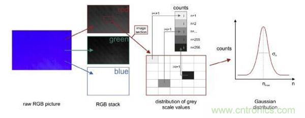 原始的RGB圖像分割成紅(red)、綠(grenn)、藍(lán)(blue)三原色,將圖像劃分為10 X 10個(gè)部分,計(jì)算分析每個(gè)部分細(xì)節(jié)。對(duì)像素點(diǎn)三原色分量灰度值進(jìn)行計(jì)數(shù),然后做成高斯分布圖,標(biāo)準(zhǔn)偏差σ和平均灰度值nmax作為圖像處理的特征量