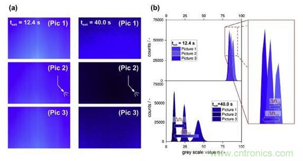 圖5.(a)在兩個(gè)干燥時(shí)刻,各自連續(xù)拍攝的三張照片的比較。捕捉第二張照片時(shí),用加壓空氣噴嘴向照相區(qū)域涂層上直接噴射空氣氣流。(b)在較短干燥時(shí)間(texit=12.4s)時(shí),三張照片中獲得的nmax都很大,差值Δn12和Δn23小并且都落在試驗(yàn)值偏差范圍內(nèi)。而texit=40.0s時(shí),三個(gè)nmax都很小,噴嘴作用導(dǎo)致的差值Δn12和Δn23很大。