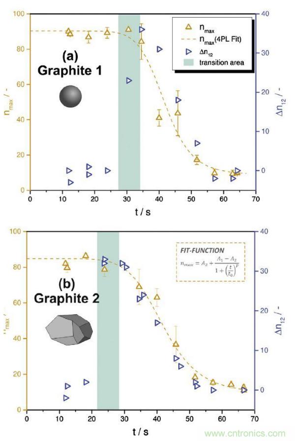 圖6.在烘干機(jī)中不同停留時(shí)間下第一張照片的nmax(三次實(shí)驗(yàn)平均值),以及第一、二張照片的差值Δn12(單次實(shí)驗(yàn))的對(duì)比:(a)Graphite 1 (球形, d50 = 8.9 μm) , (b) Graphite 2 (多面體, d50 = 20.4 μm)。nmax與四參數(shù)邏輯(4PL)擬合曲線近似,并表明了不同的初始平臺(tái)。從恒定nmax平臺(tái)到中間階段的過(guò)渡時(shí)域以綠色突出顯示。