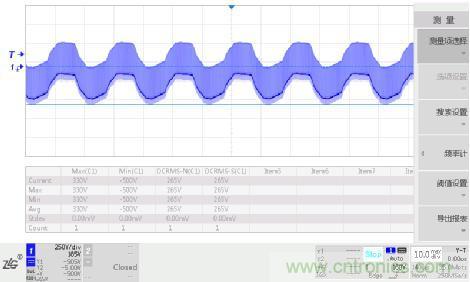 實(shí)測(cè)100~240VAC輸入開(kāi)關(guān)電源初次級(jí)最大電壓波形如下圖3所示,工作電壓峰值為500V,工作電壓有效值為265V,根據(jù)表2J可知交流電網(wǎng)電源瞬態(tài)電壓為2500V。