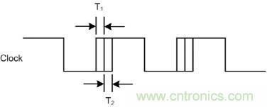 時鐘信號邊沿變化的不確定時間稱為時鐘抖動,如圖 2所示。一般情況下的時序分析是不考慮時鐘抖動,如果考慮時鐘抖動,則建立時間應該是Tsu+T1,保持時間應該是Th+T2。