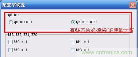 芯片中的配置參數(shù)需要手動(dòng)修改,不能單純的加載文件后直接進(jìn)行燒錄,如果不按照正確的規(guī)則設(shè)置參數(shù),必然會(huì)導(dǎo)致芯片無(wú)法正常運(yùn)行。在SPI Flash的芯片燒錄時(shí)經(jīng)常遇到這類問(wèn)題,類似于”QE”位必須使能,如下圖。