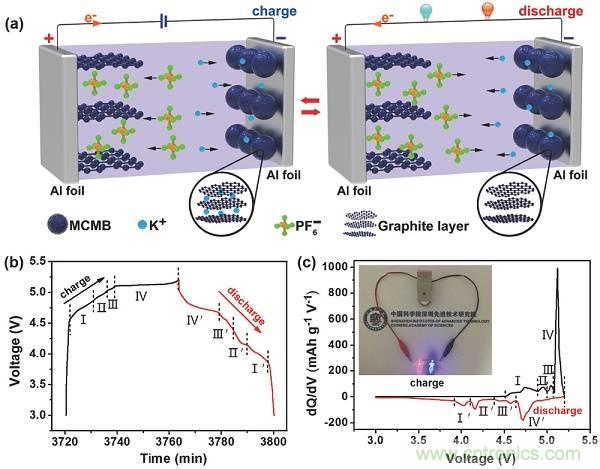 近日,中科院深圳先進技術研究院唐永炳研究員(通訊作者)課題組在Adv. Energy Mater.上發(fā)表了一篇名為“A Dual-Carbon Battery Based on Potassium-Ion Electrolyte”的文章。研究人員開發(fā)了基于鉀離子電解液的新型雙碳電池(命名為K-DCB),其中中間相碳微球作為負極材料,膨脹石墨作為正極材料。實驗人員研究了K-DCB的工作機理:充電時,K+運動到石墨負極并嵌入到石墨層間形成插層化合物,同時PF6-運動到正極,插層到中間相碳微球的層間;放電時則相反。結(jié)果表明,該K-DCB在3.0~5.2V的電壓窗口范圍,1C的電流密度下可以提供61mAh g-1的可逆比容量,并且具有良好的循環(huán)性能,循環(huán)100次后容量幾乎無衰減。此外,該K-DCB具有較高的放電中值電壓(4.5V),能夠滿足一些高電壓設備的要求。K-DCB具有環(huán)保、成本低、能量密度高等優(yōu)點,對未來能源儲存應用極具潛力。