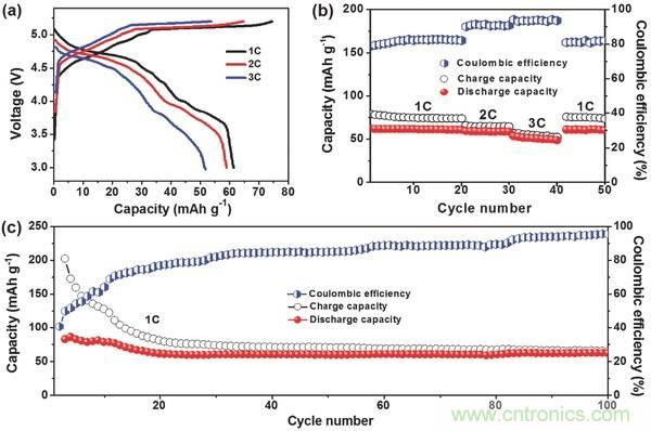 a)在1、2、3C不同電流密度下電池的充放電曲線