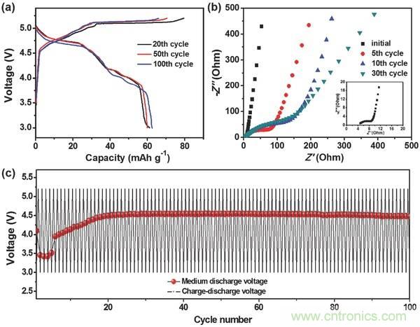 a)第20、50和100次循環(huán)過程中K-DCB的充放電曲線