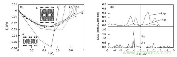 圖5.不同結(jié)構(gòu)石墨烯與Li相互作用:(a)少層石墨烯; (b) Li與摻N石墨烯的態(tài)密度
