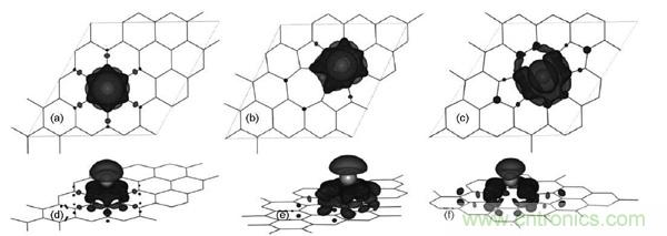 圖6.Li在缺陷石墨烯上電子差分密度圖:(a, d)完整石墨烯;(b, e) V1缺陷;(c,f)V2缺陷