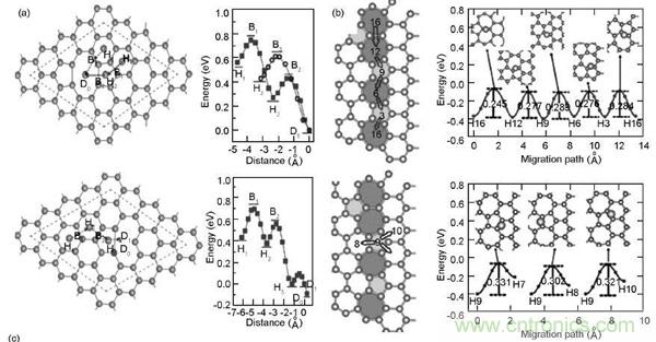 計(jì)算表明,Li在完整石墨烯表面的擴(kuò)散勢壘是0. 32 eV,表明Li易沿著石墨烯表面擴(kuò)散,利用石墨烯作為負(fù)極時(shí)往往具有良好的倍率性能。科學(xué)家的計(jì)算結(jié)果表明,當(dāng)Li在完整石墨烯上沿著六元環(huán)中心頂部—C—C鍵中間六元環(huán)中心頂部路徑擴(kuò)散時(shí),最高的能量阻礙在Li跨過C—C鍵的位置,能量勢壘為0. 311 eV;沿著六元環(huán)中心頂部—C原子頂部六元環(huán)中心頂部擴(kuò)散時(shí),C原子頂點(diǎn)為能量壁壘,0. 337 eV。當(dāng)Li在兩層石墨烯的層間擴(kuò)散時(shí),同樣具有較低的擴(kuò)散能壘。