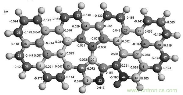 科學(xué)家使用團(tuán)簇結(jié)構(gòu)的石墨烯模型研究了含N石墨烯在酸性環(huán)境中對O2的催化機(jī)理。計(jì)算表明,OOH吸附在靠近吡啶結(jié)構(gòu)N的C原子上,其中一個(gè)O與C原子相互作用,并且該C原子從石墨烯平面伸出。對于吡咯N,OOH同樣會吸附在靠近N 的C原子上。當(dāng)在OOH上進(jìn)一步增加H后,吡啶N和吡咯N石墨烯上都會形成不穩(wěn)定的HOOH,O—O鍵長增加,容易變成兩個(gè)OH,所以在N石墨烯上的ORR是四電子過程。同時(shí),作者提出自旋密度和電荷密度是決定催化效果的關(guān)鍵因素。盡管有的C電荷密度非常高,但是OOH更容易吸附在具有高自旋密度的C原子上。與電荷密度相比,自旋密度更能決定催化活性位,只有當(dāng)自旋密度非常小時(shí)電荷密度才起作用。圖9給出了所計(jì)算的摻N石墨烯上電荷密度和自旋密度分布。
