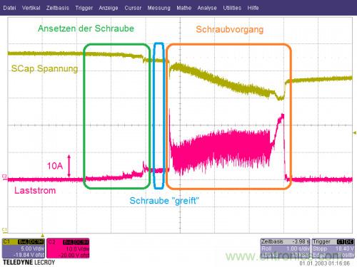 圖5顯示了測量得出的電鉆及電動螺絲刀工作循環(huán)。帶有短時脈沖和極具波動特點的工作電流(圖中的Imax約25A,根據(jù)電鉆及電動螺絲刀具體情況也可最高達(dá)到85A)可與電池輸出電流完全隔離,以便電池始終能在其定義的舒適區(qū)域運行(典型的穩(wěn)定電池電流2-3A)。同時這也會對其使用壽命產(chǎn)生持續(xù)性積極影響。