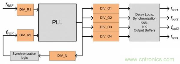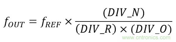 圖 1 為高性能時(shí)鐘設(shè)備的基本 PLL 架構(gòu)。該設(shè)計(jì)使用比例因子為 PLL 輸出端口提供時(shí)鐘合成。最終輸出頻率的基本公式為: