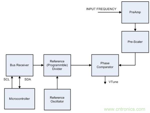 如圖 2 所示,將時(shí)鐘 IC 連接到微控制器電路。時(shí)鐘 IC 具有內(nèi)部 PLL 模塊,其功能是提供作為固定直流電壓的調(diào)諧電壓 (Vtune) ,而調(diào)諧電壓將隨頻段而變化。PLL 模塊在輸入端接收本地振蕩器頻率,由內(nèi)部前置放大器放大信號(hào)。另外,預(yù)分頻器對(duì)輸入頻率進(jìn)行下變頻,并將其作為輸入傳送至相位比較器。