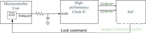 對(duì)某些應(yīng)用而言,輸出時(shí)鐘頻率應(yīng)通過使用模擬反饋跟蹤輸入數(shù)據(jù)流。如圖 5 所示,時(shí)鐘 IC 作為大鎖相環(huán)的一部分。ASIC 或 SoC 負(fù)責(zé)跟蹤輸入流、計(jì)算誤差并產(chǎn)生 PWM 信號(hào)(通常來說),隨后將誤差信息反饋至本地時(shí)鐘發(fā)生器以進(jìn)行頻率調(diào)諧。