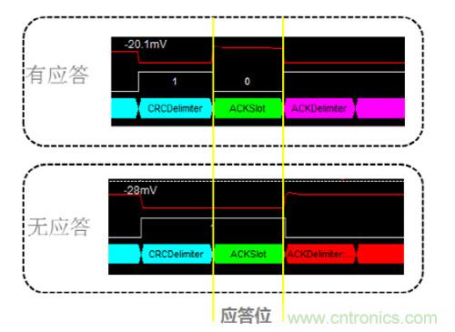 為什么會(huì)發(fā)生這種錯(cuò)誤呢?發(fā)送報(bào)文的節(jié)點(diǎn)會(huì)在ACK段發(fā)送兩個(gè)隱性位,若在第一個(gè)位期間接收到顯性電平則認(rèn)為該幀被正確接收。由于仲裁段相同時(shí)兩節(jié)點(diǎn)都認(rèn)為自己取得仲裁權(quán),在ACK段等待應(yīng)答,但該網(wǎng)絡(luò)中僅存在兩個(gè)節(jié)點(diǎn),因此在ACK段不能收到應(yīng)答,進(jìn)而發(fā)生應(yīng)答定界符錯(cuò)誤。簡(jiǎn)單說來這種情形就類似于總線中只有一個(gè)節(jié)點(diǎn)將不能實(shí)現(xiàn)數(shù)據(jù)發(fā)送。圖7是在ACK段有無(wú)應(yīng)答時(shí)的波形對(duì)比。