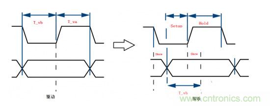 上圖中,T_vb與T_va表示的是主控芯片在輸出數(shù)據(jù)時(shí)時(shí)鐘與數(shù)據(jù)之間的時(shí)序參數(shù)。在理想情況下,時(shí)鐘邊沿和數(shù)據(jù)電平的中心是對(duì)齊的,由于時(shí)鐘和數(shù)據(jù)傳輸通道不等長(zhǎng),使得時(shí)鐘邊沿沒(méi)有和數(shù)據(jù)脈沖的中間位置對(duì)其,使得建立時(shí)間的裕量變小。在理解了這些基礎(chǔ)問(wèn)題之后,我們需要做的就是將這些時(shí)間參數(shù)轉(zhuǎn)化為線長(zhǎng)。